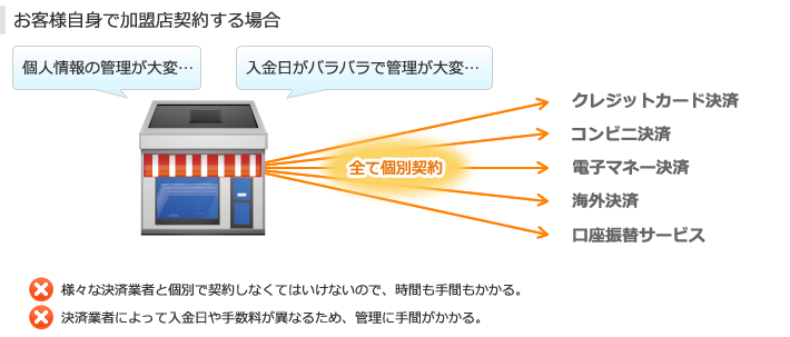 ネットショップなどでクレジットカート決済やコンビニ決済をする場合、通常は運営されているお店が様々なカード会社やコンビニと直接契約していかねばなりません。