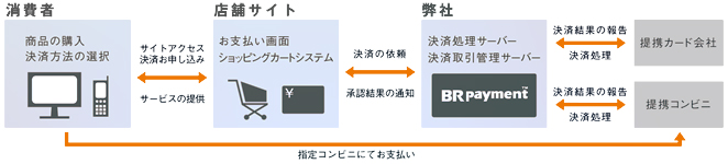 商品を購入されたお客様が決済方法を選択され入金されると、決済処理サーバーがまとめて決済処理し、運営店舗様に承認結果を通知し、お支払いまでを行います。
